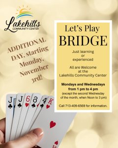 As of November 3, 2025, Bridge meets on Mondays, as well as Wednesdays, from 1-4 pm (except for the second Wednesday, when from noon to 3 pm.)