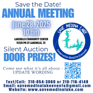 Save Medina Lake Annual Meeting. Doors open at 12 pm for Silent Auction. 210-854-3060